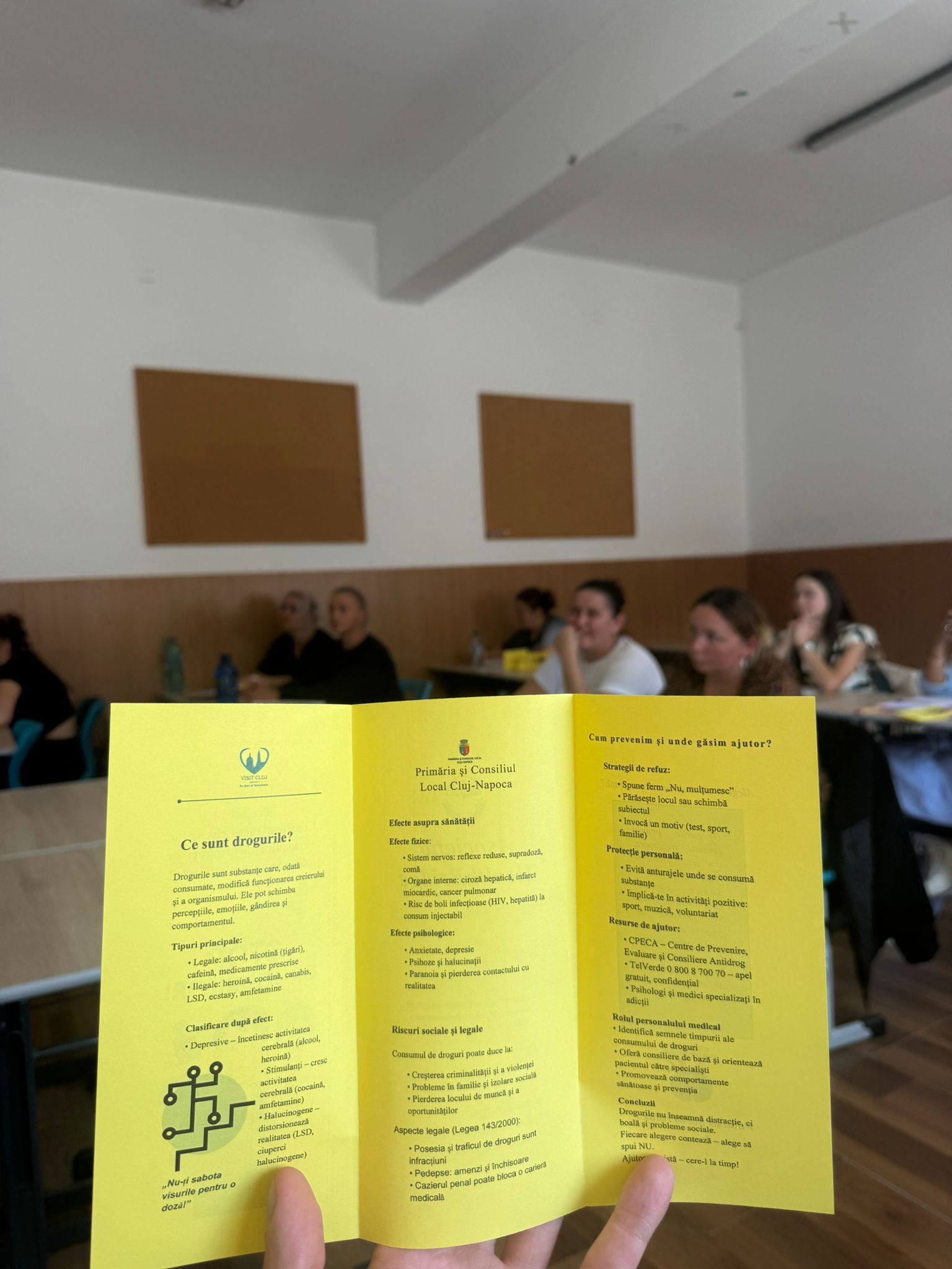 În perioada iunie – noiembrie 2025, vor avea loc patru sesiuni interactive în unități de învățământ postliceal din Cluj-Napoca, însoțite de distribuirea de materiale informative dedicate prevenirii consumului de substanțe interzise și de aplicarea unor instrumente de evaluare a impactului educațional.